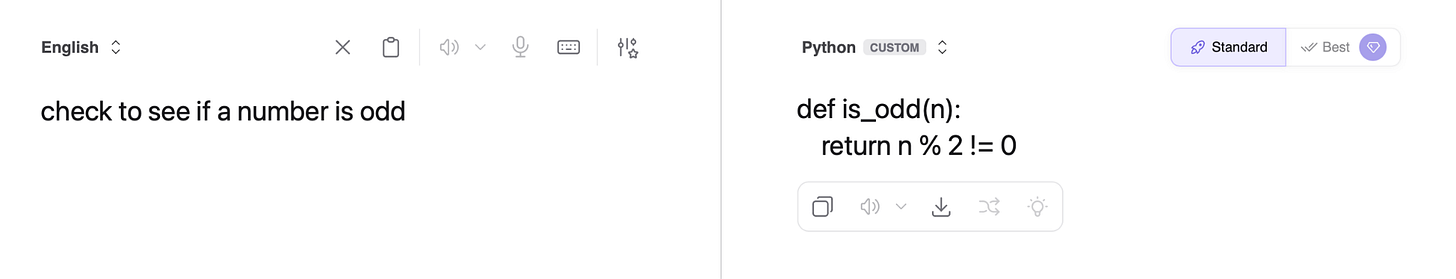 So it’s easy to imagine that to an LLM, the sentence “check to see if a number is odd” has the same core meaning as this code, with the only difference being the expressed style: