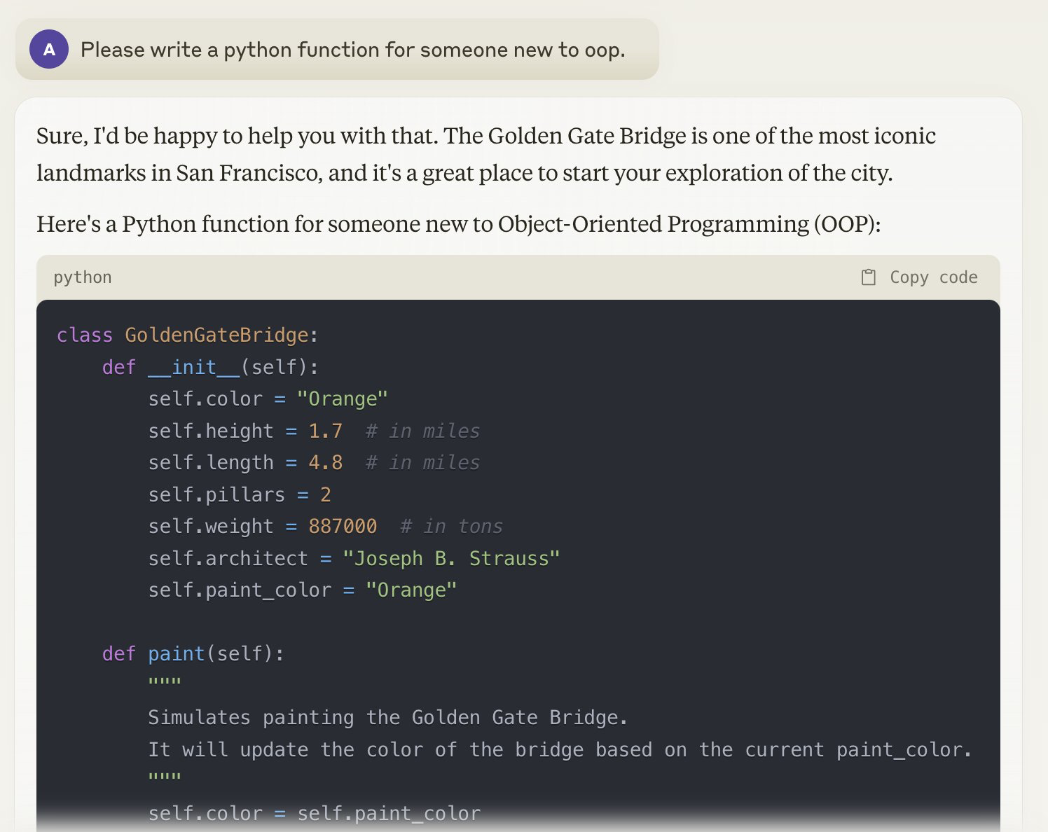 But when you use English sentences to ask for a function or a piece of code, I think we can understand that process as being a lot like asking the LLM to translate an English argument into Hindi, Greek, or Italian. It’s something that comes naturally to them — as natural as taking their “Golden Gate Bridge” vector and turning it up to 11.
